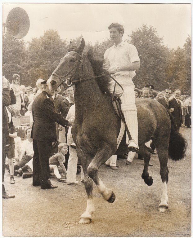 Following in his father, the Duke of Edinburgh’s footsteps, Charles was an enthusiastic and able cricketer. In 1971 he arrived on horseback, all padded up for a cricket match at Cranwell in Lincolnshire. Prince Charles was in an RAF team against the Lord’s Taverners. He batted gamely and scored 17 runs but was bowled by the recently retired Surrey and England cricketing legend, Ken Barrington. Undeterred Prince Charles returned to the crease to bowl 7 overs and wreaked revenge on Ken Barrington by bowling him out.