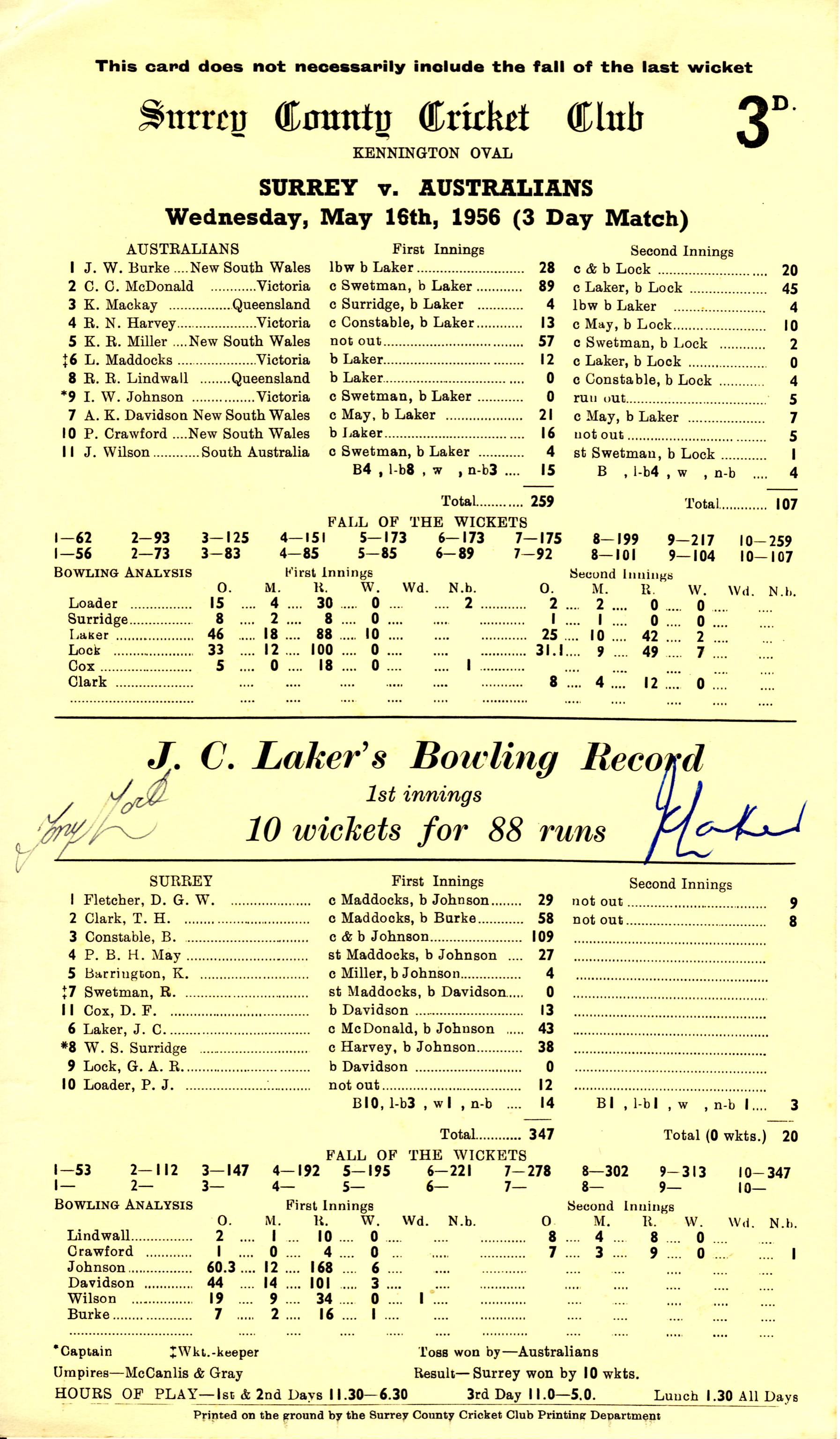 The game was at Lord’s. Somehow the Australians scored only 41 yet won the match by 9 wickets. England, led by WG Grace, were bowled out twice in an afternoon, scoring just 33 and 19. The scorecard belonged to Alick Bannerman, the famous “stone-waller”, and has his name printed to the reverse.