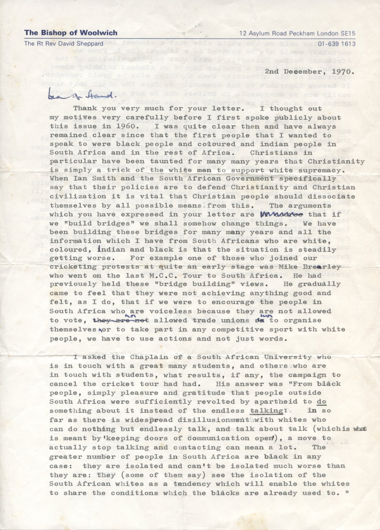 As the Bishop of Woolwich, David Sheppard wrote this letter in 1970. Here he sets out clearly his views about England cricket’s relationship with South Africa at the time.