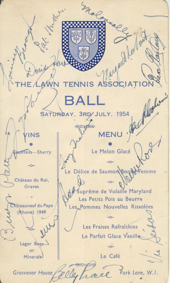 The 1954 Wimbledon Tennis Championship was hugely significant for its two eventual champions: Male singles champion, Jaroslav Drobny and female singles champion, ‘Little Mo’ Maureen Connolly. 32 year old Drobny won his first and only Wimbledon title in 1954 after 11 previous, unsuccessful attempts. He also won the competition as an Egyptian citizen, the only Egyptian citizen to do so in the history of Wimbledon. For 19 year old ‘Little Mo’ Connolly, already a phenomenon in tennis, the 1954 women’s Wimbledon title was to be her third and unexpectedly her last. They, along with several of their finalists, signed this dinner menu for the ball (code: 38174), celebrating the end of that year’s Wimbledon competition.