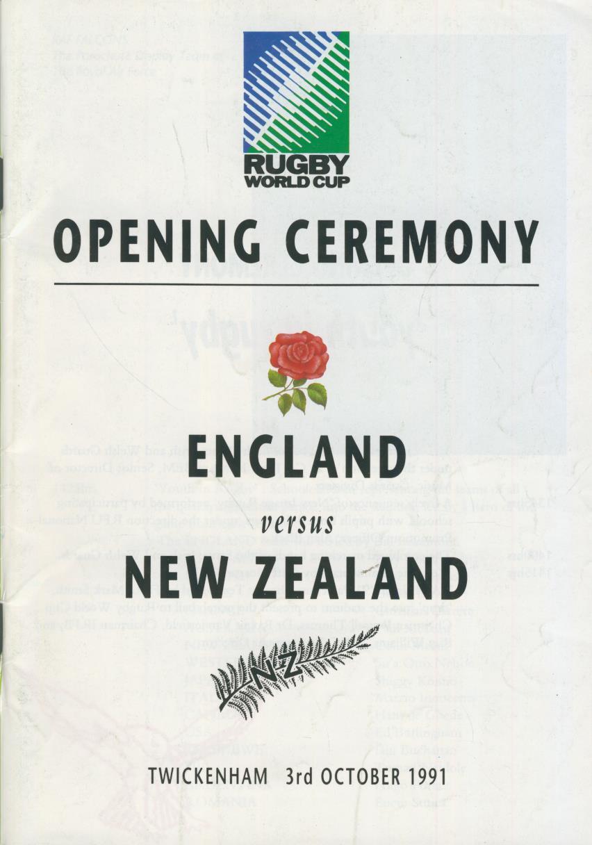 Official programme for the Opening Ceremony of the 1991 Rugby World Cup, held on October 3rd. This also doubled as the programme for the opening match between England and New Zealand.