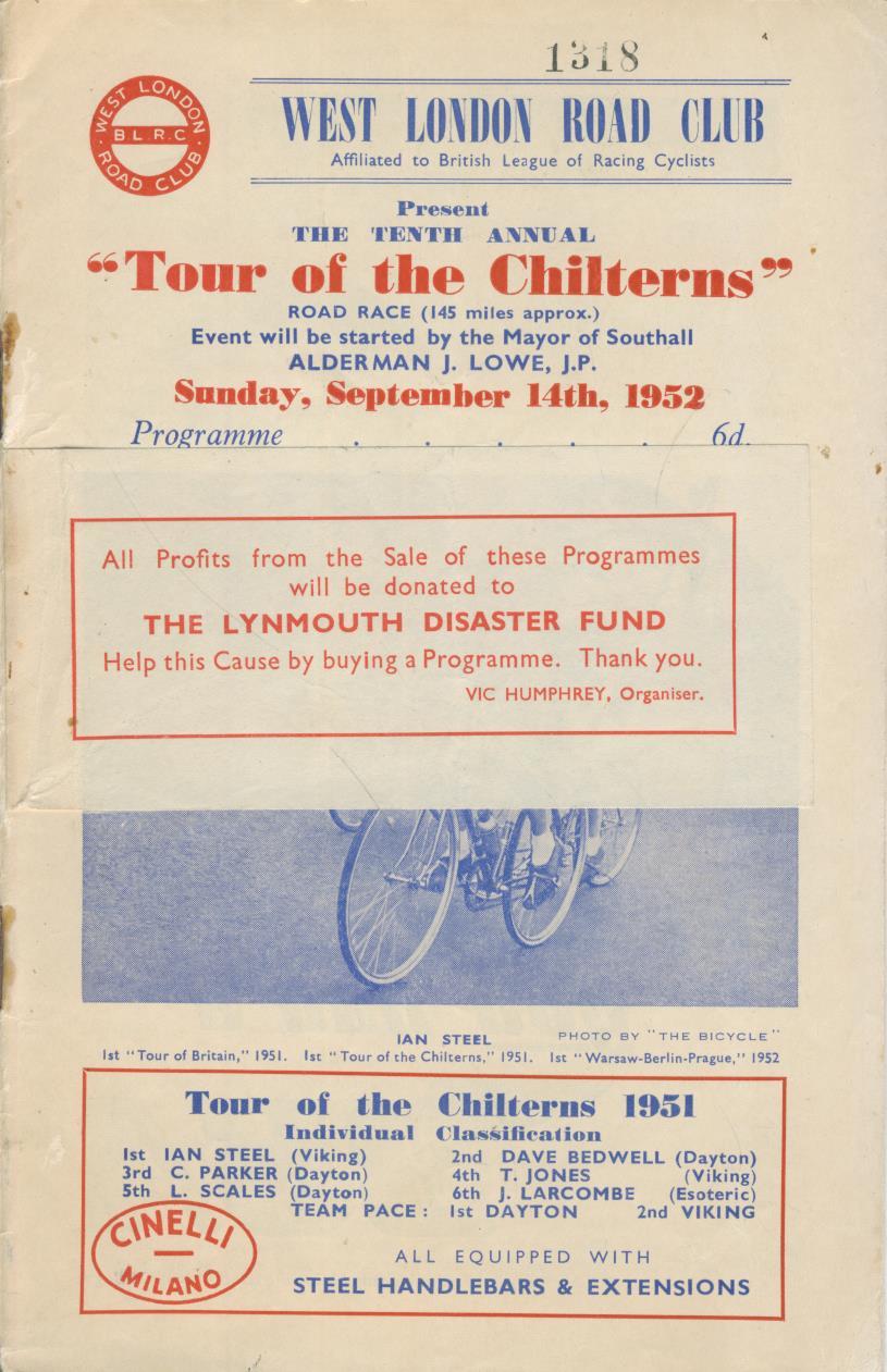 Official programme for the 10th annual "Tour of the Chilterns" cycle race, held on September 14th, 1952. Contains route, list of competitors etc. Profits from the sale of the programme were donated to the Lynmouth Disaster Fund.