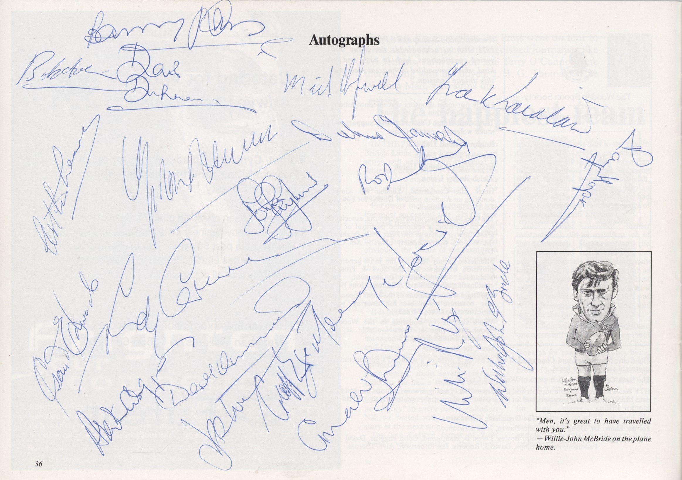 A souvenir brochure published to mark the 25th anniversray of the 1971 British Lions tour. Includes the menu for the dinner organised by the Wooden Spoon Society, as well as articles, player portraits etc. Signed to the autographs page by 21 players from the 1971 Lions tour, including Edwards, McBride, Duckham, Laidlaw, John, Hopkins, Hipwell, Evans, JPR Williams, Taylor and Brown.