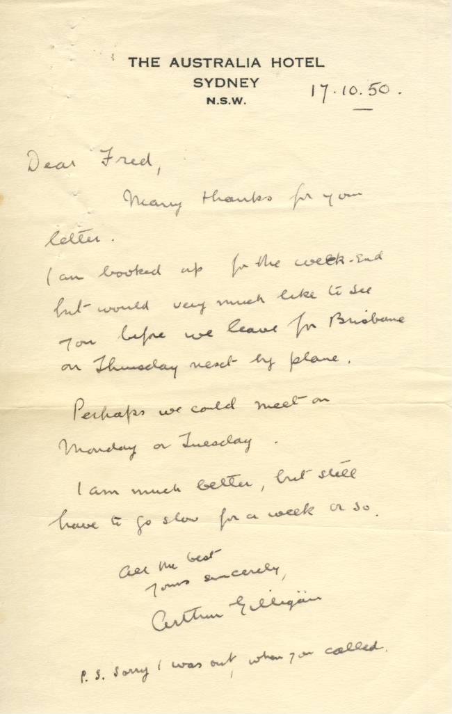 Cricket autograph. Handwritten letter in ink on headed notepaper from the Australia Hotel, Sydney, dated 17 October 1950. Routine content.