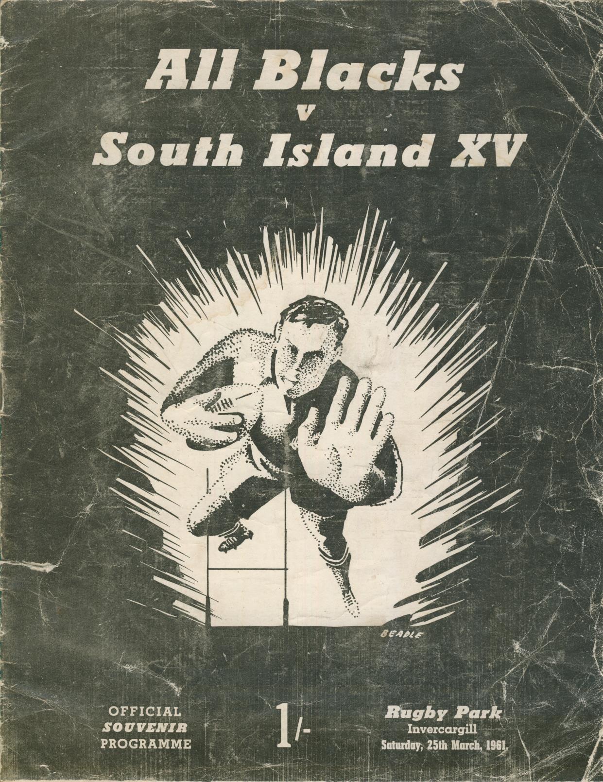 Official programme for the match played at Invercargill on March 25th 1961. The match was arranged to help raise money for the Old Boys Rugby Football Club.