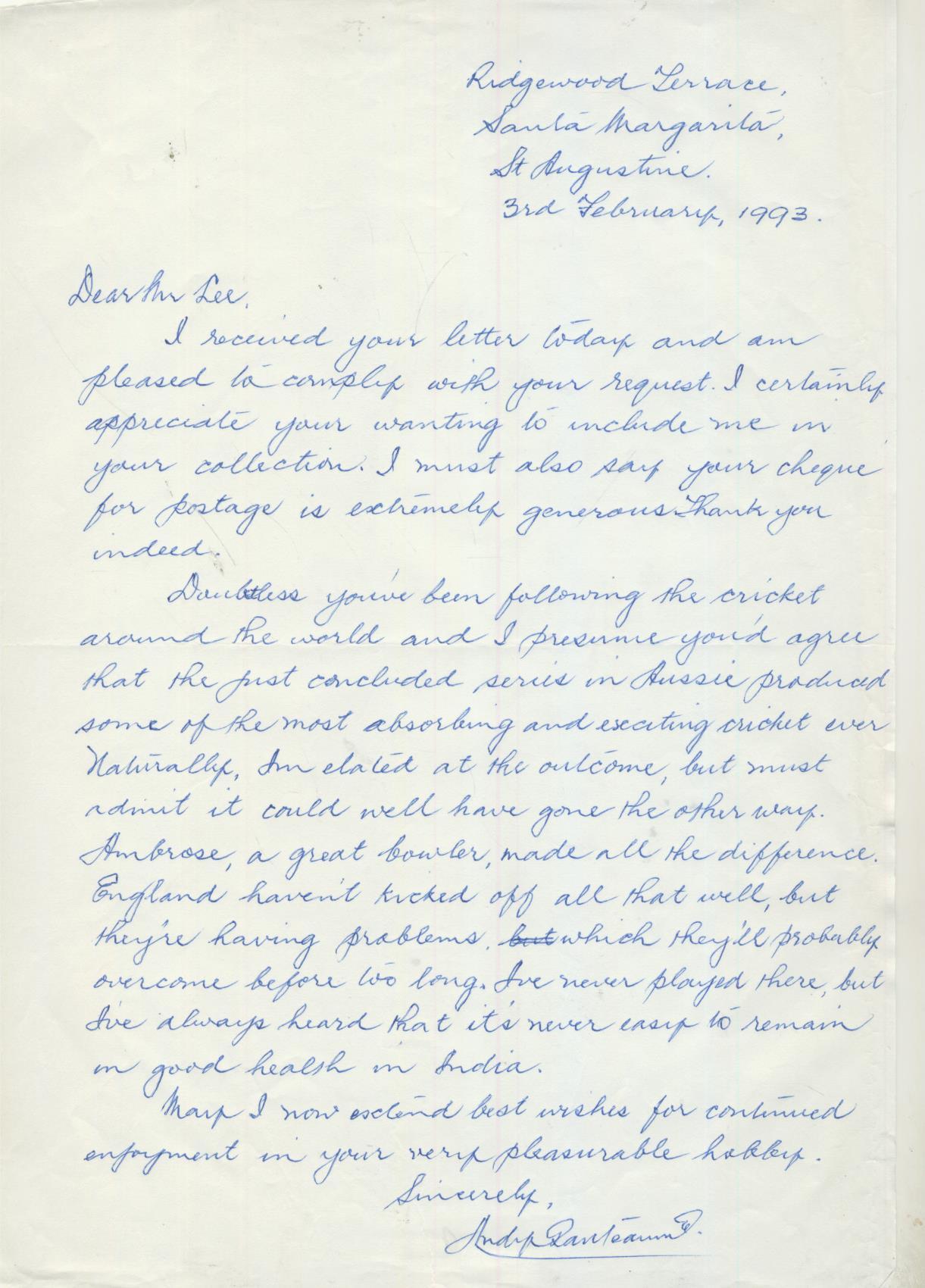 Single sheet letter written in response to a request by an autograph collector. In the letter Ganteaume talks about the recent Australia- West Indies series (1992-93) and of other cricket around the world. Sent from his address in St Augustine and very nicely signed at the bottom.