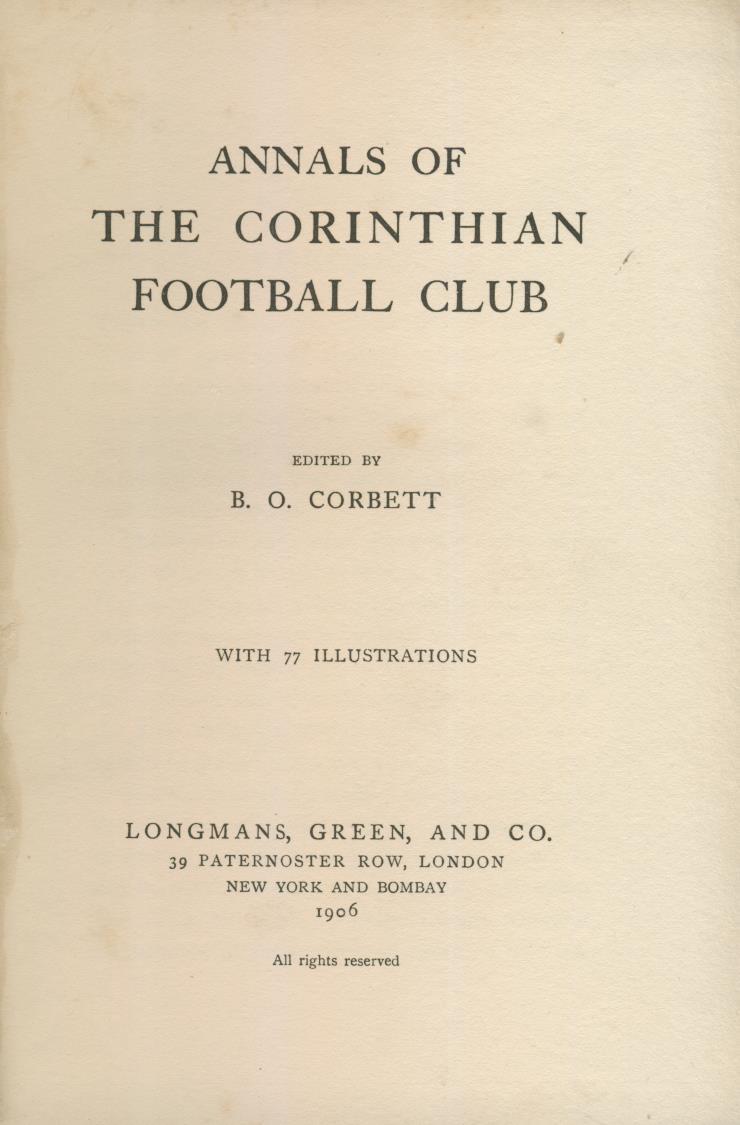 Football book. A history of the celebrated English amateur side, founded in 1882 by N. Lane Jackson, whose name became synonymous with fair play. With notes on the players, details of tours abroad, full results record and a chapter extolling the 'Corinthian Way'.
