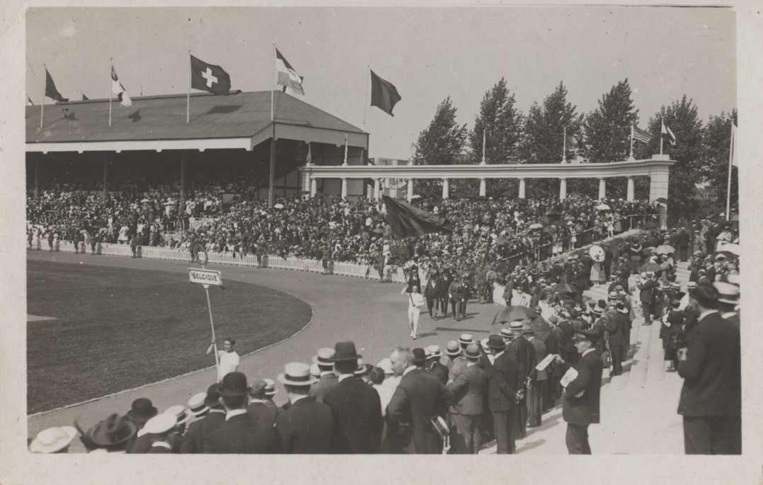 Original postcard from the 1920 Olympic Games in Antwerp. This shows the beginning of the Parade of Nations (as part of the opening ceremony) with the Belgian hosts leading out.