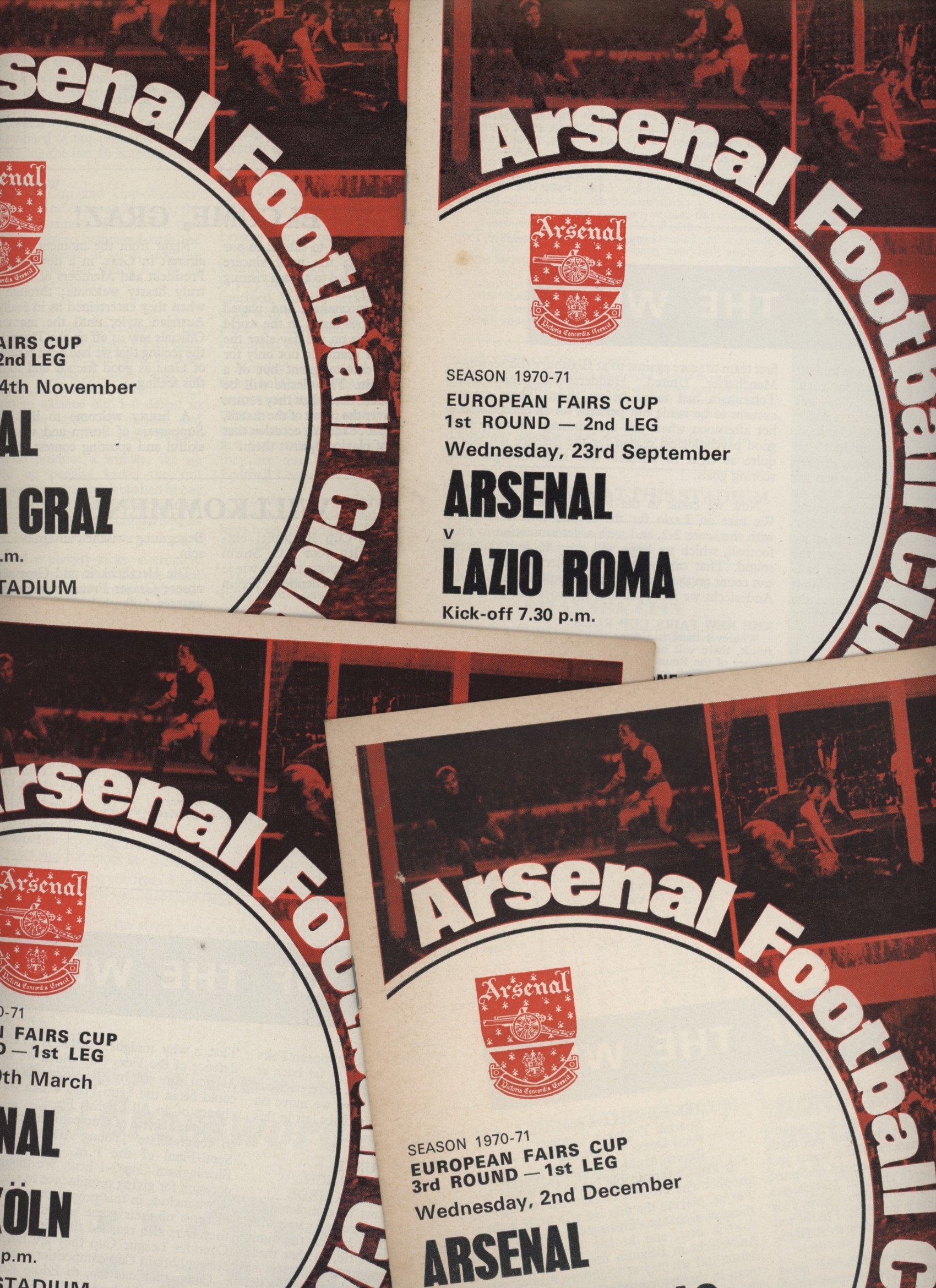 Four home programmes from Arsenal's 1970-71 Fairs Cup campaign. Includes the games v Lazio, Sturm Graz, Beveren Waas and F.C. Koln.