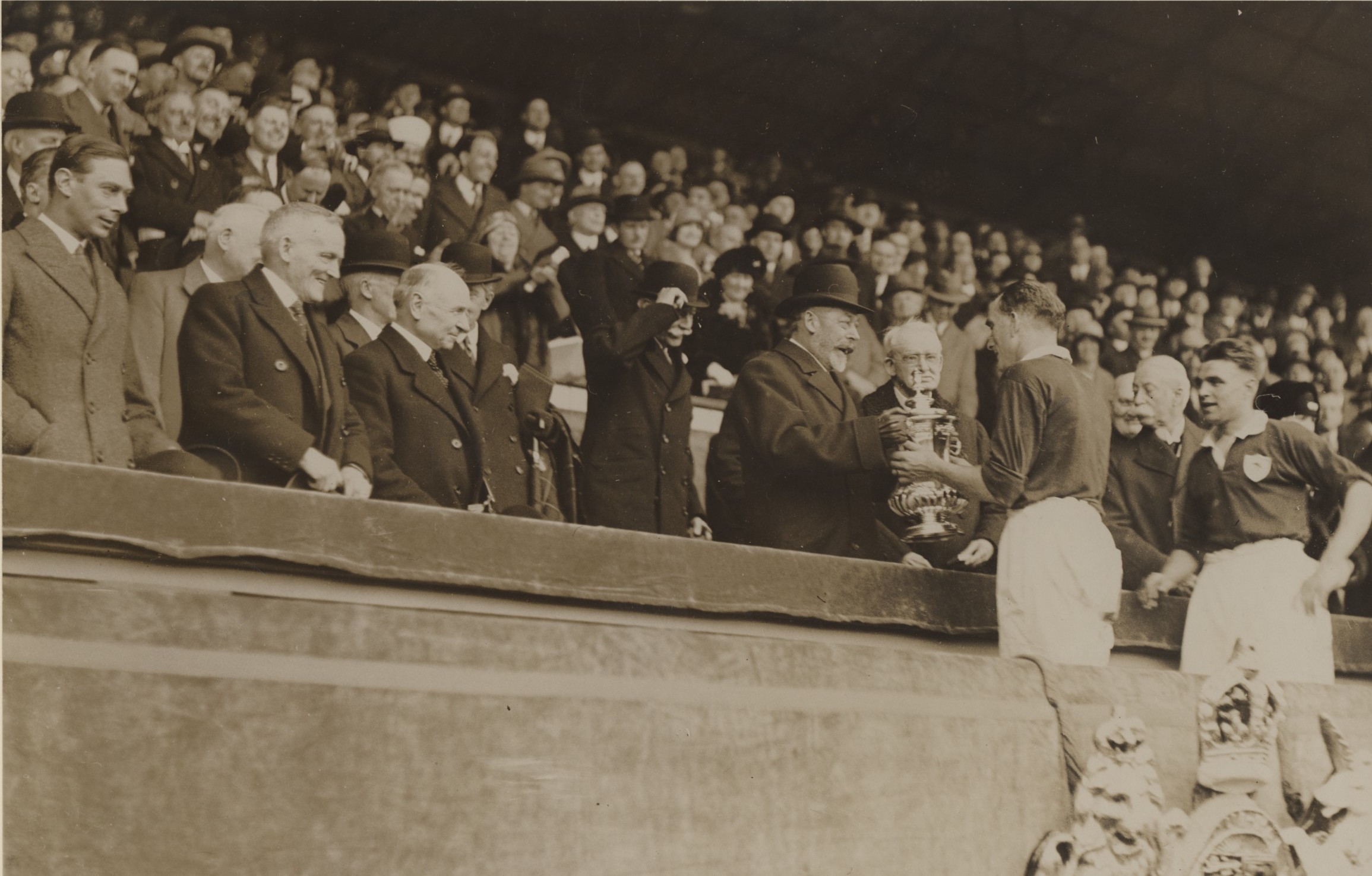 Original large sepia photograph of Tom Parker, the Arsenal captain, being presented with the FA Cup by King George V. Arsenal defeated Huddersfield Town 2-0, with goals from James and Lambert.