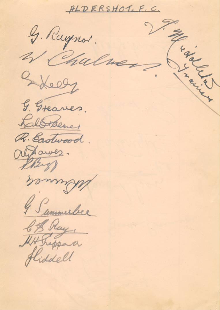 Album page. Signed in ink by 14 Arsenal players from the late 1930s, including Joy, Male, Swindin, Curtis, Nelson, Cartwright, Fields, Morgan, Pugh, Bremner and Lewis. Signed on the reverse by 13 Aldershot players and the Trainer, including Raynor, Kelly, Greaves, Eastwood, Summerbee, Liddell and Chalmers.