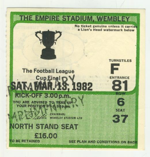 Ticket for the League Cup Final, held at Wembley on March 13th 1982.
