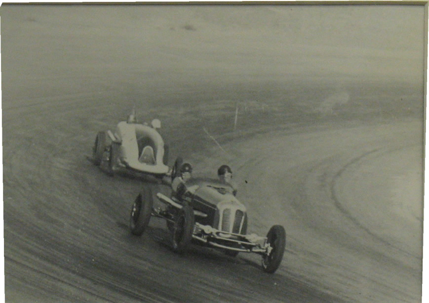 Original black and white photograph by Wilson Photo. Rex Mays, in a Gilmore Special, leads Fred Frame,who is driving a Miller "Catfish".