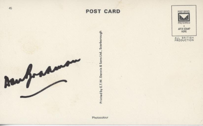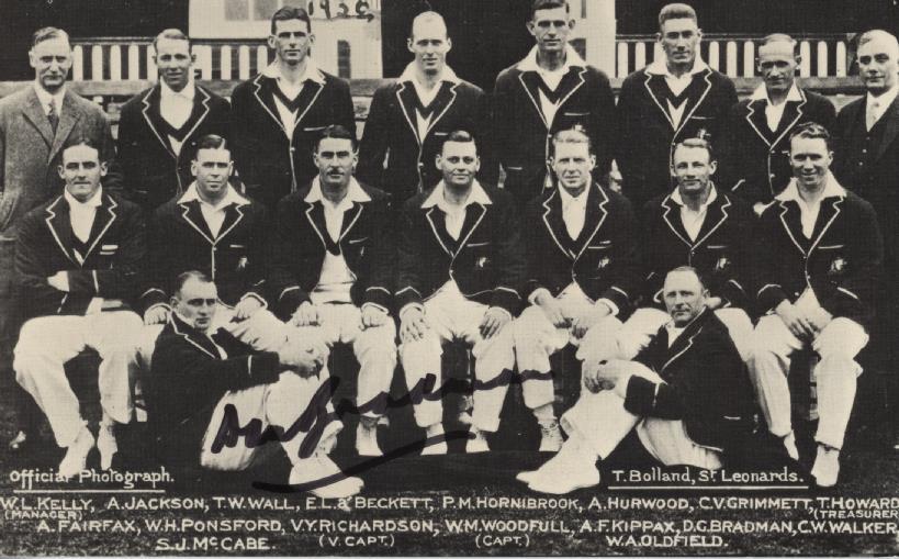 Modern cricket postcard from an original photograph by T. Bolland of St Leonards. Team members named to front. Postally unused. Signed nicely by Don Bradman in later years in black marker. He has also signed the reverse. Very good condition.