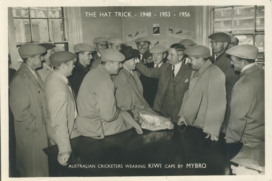 Original promotional photograph taken of the 1956 Australian cricket team during their tour of England. The photograph was taken on May 10th when the cricket team visited Myers Bros. of Leeds and shows them all wearing "Kiwi" caps made by the firm. They had clearly supplied these caps for the touring Australians in 1948 and 1953 as well. The visit took place during their match against Yorkshire at Bradford.