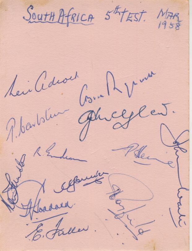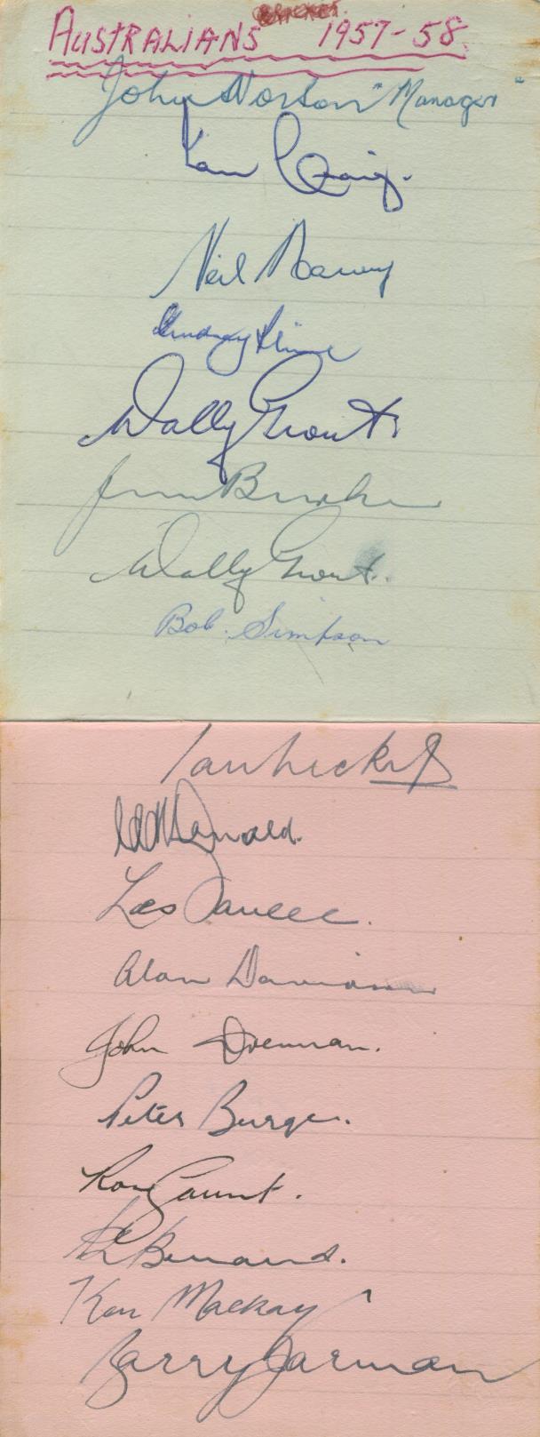 Two album pages signed by the full Australian cricket team that toured South Africa in 1957-58 (16 players and the manager) and to the reverse of one sheet by the 12 South Africans picked for the fifth Test match in Port Elizabeth. Australian autographs include Craig, Harvey, Grout (twice), Benaud, Burge, Davidson and Simpson. The South Africans include Adcock, McGlew, Goddard, Endean and Tayfield.