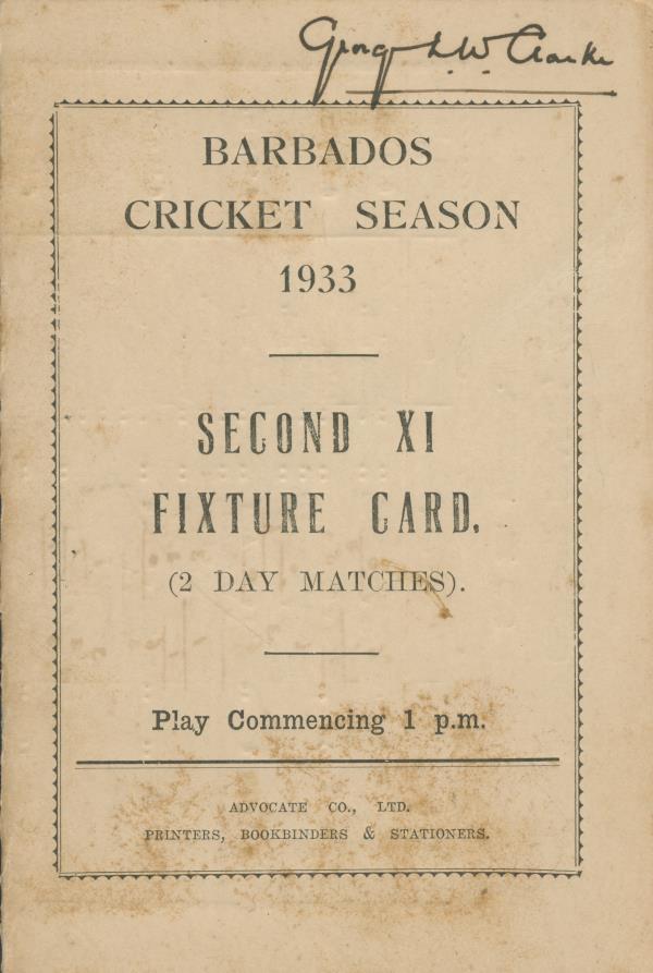 Single folded card with full fixture list for the Barbados Cricket Association 2nd XI matches in 1933 inside and continued on the reverse. Formerly the property of George Clarke of the Pickwick Club.