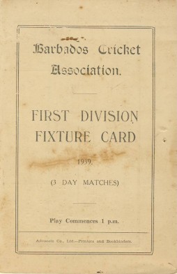 Single folded card with full fixture list for the Barbados Cricket Association 1st Division matches in 1939 inside. Formerly the property of George Clarke of the Pickwick club.