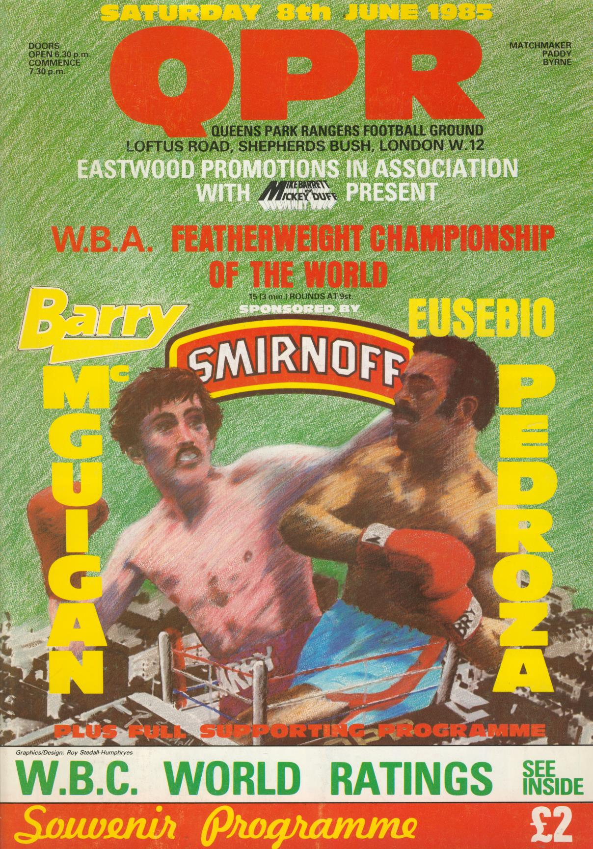 Programme for the famous fight at Loftus Road, London, 8th June 1985. McGuigan defeated Pedroza to win the world featherweight title. Herol Graham, Dave McAuley also on the card.