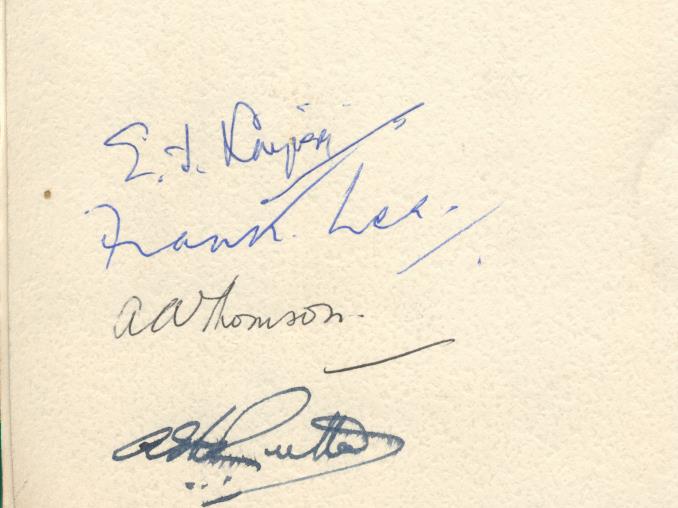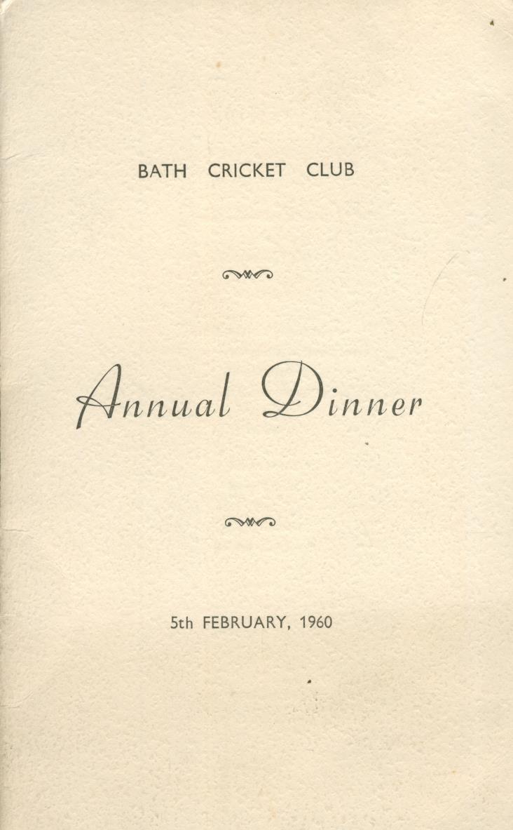 Menu card for the Annual Dinner, February 5 1960. Signed on the reverse in ink by EF Longrigg (Somerset 1925-47), FS Lee (Somerset 1929-47), AA Thomson and Rev. Alan Rutter (both of Bath CC).