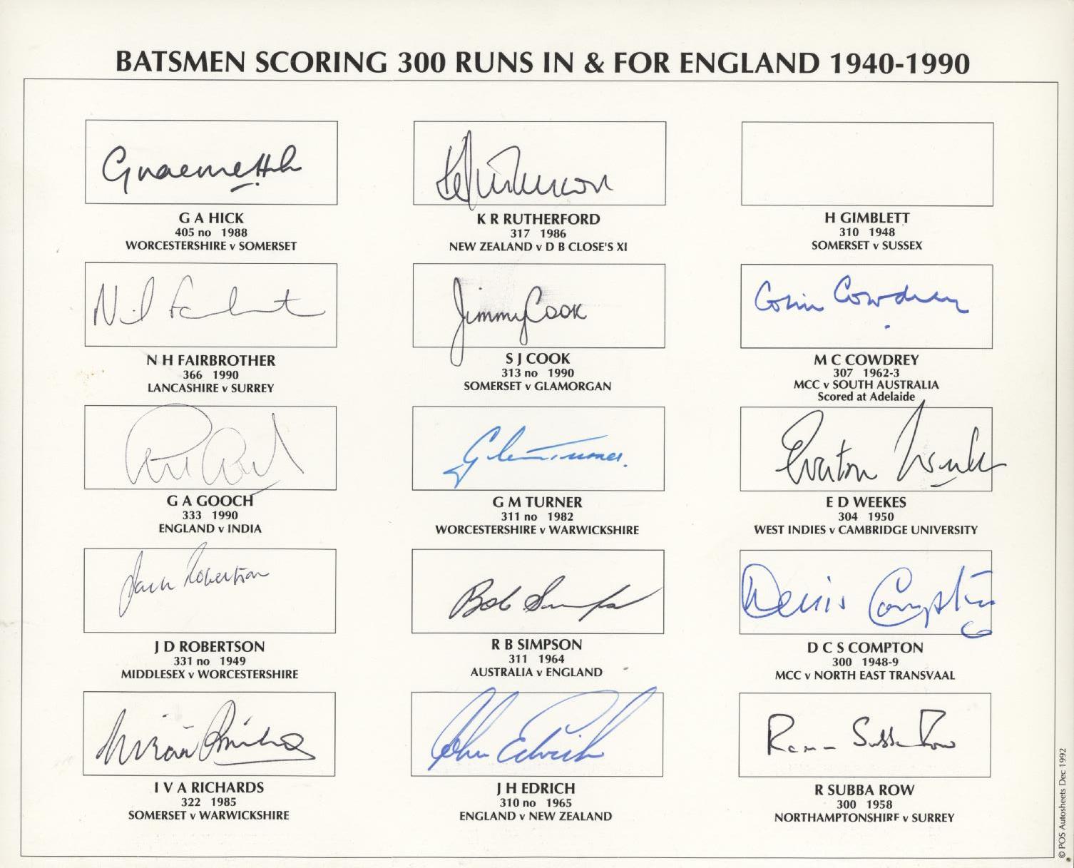 Printed card with individual boxes, signed by the 15 living cricketers who had scored over 300 runs in an innings in and/or for England between 1940 and 1990. The only ommission is Harold Gimblett, who had died by this time. Autographs include Gooch, Viv Richards, Hick, Turner, Simpson, Compton, Edrich and Weekes.