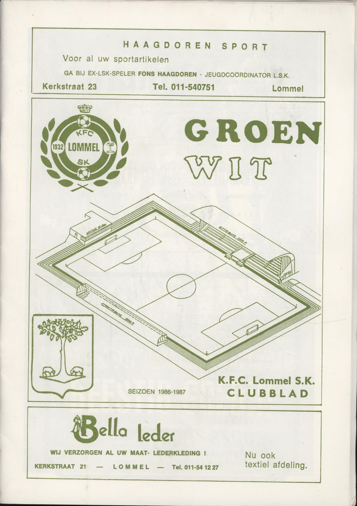 Programme produced by the now defunct Belgian football club KFC Lommel, the Groen Wit (Green and Whites), to mark their hosting of an international U15 boys' match played against an England side featuring Andy Cole: the away side is printed on a separate sheet which is slipped inside.