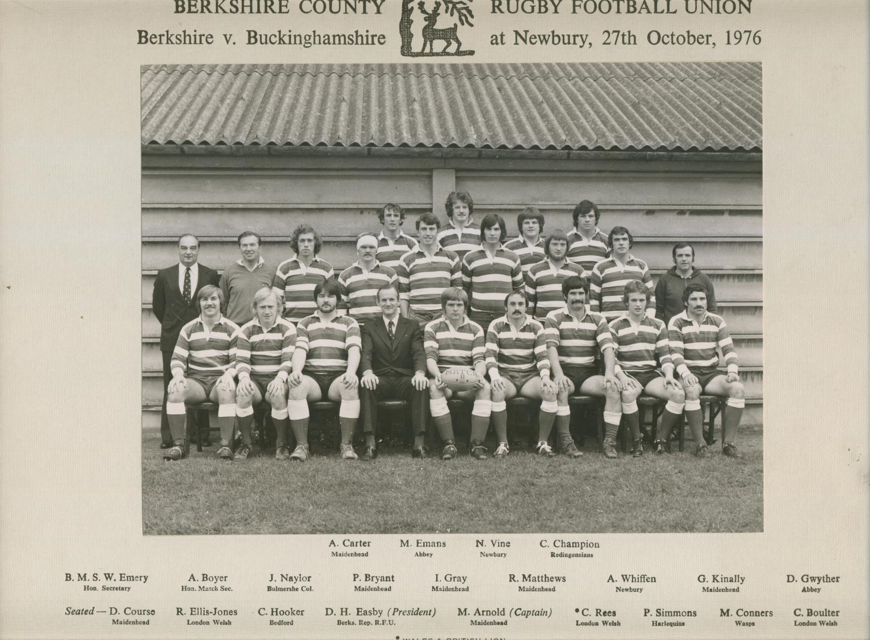 Photograph of the Berkshire team that played Buckinghamshire in 1976, mounted on card with player names printed below, including the Wales and British Lions winger, Clive Rees. Photo 16x21cm. Very good condition.