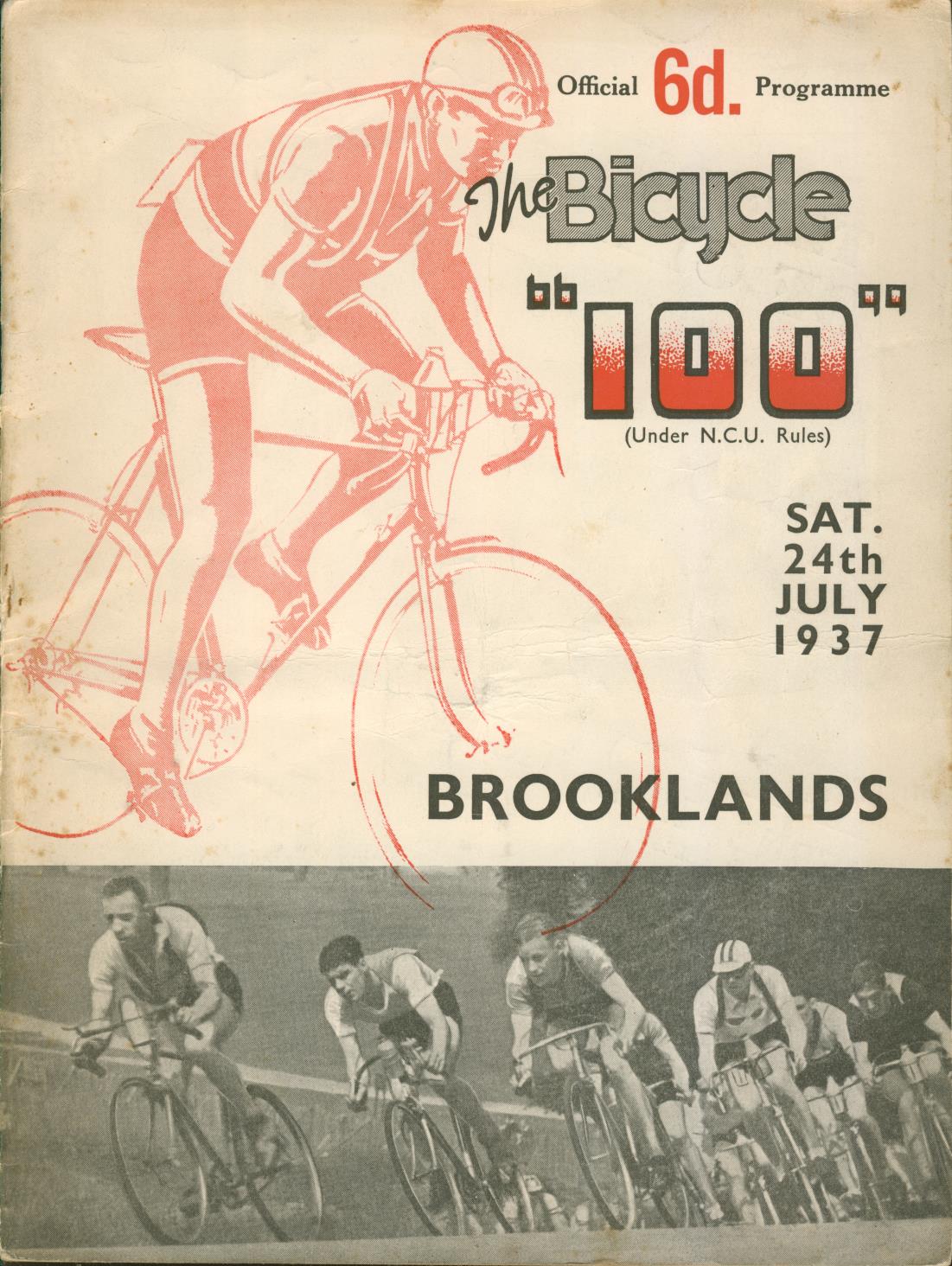 Official programme for the "100" cycle race, promoted by The Bicycle magazine and held at Brooklands on July 24th 1937. Contains articles, complete list of entrants, some action photographs and portraits of some of the favourites.
