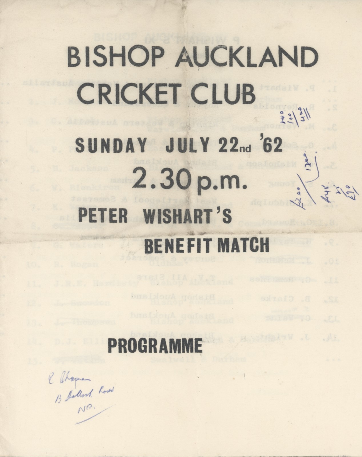Official programme for the cricket match played on July 22nd 1962 between Bishop Auckland and Peter Wishart's XI. Players involved included Gary Sobers and five Australians - Wishart, R. Reynolds, M. Vernon, G. Howard and P Philpott. Ken Biddulph (Somerset) also played.