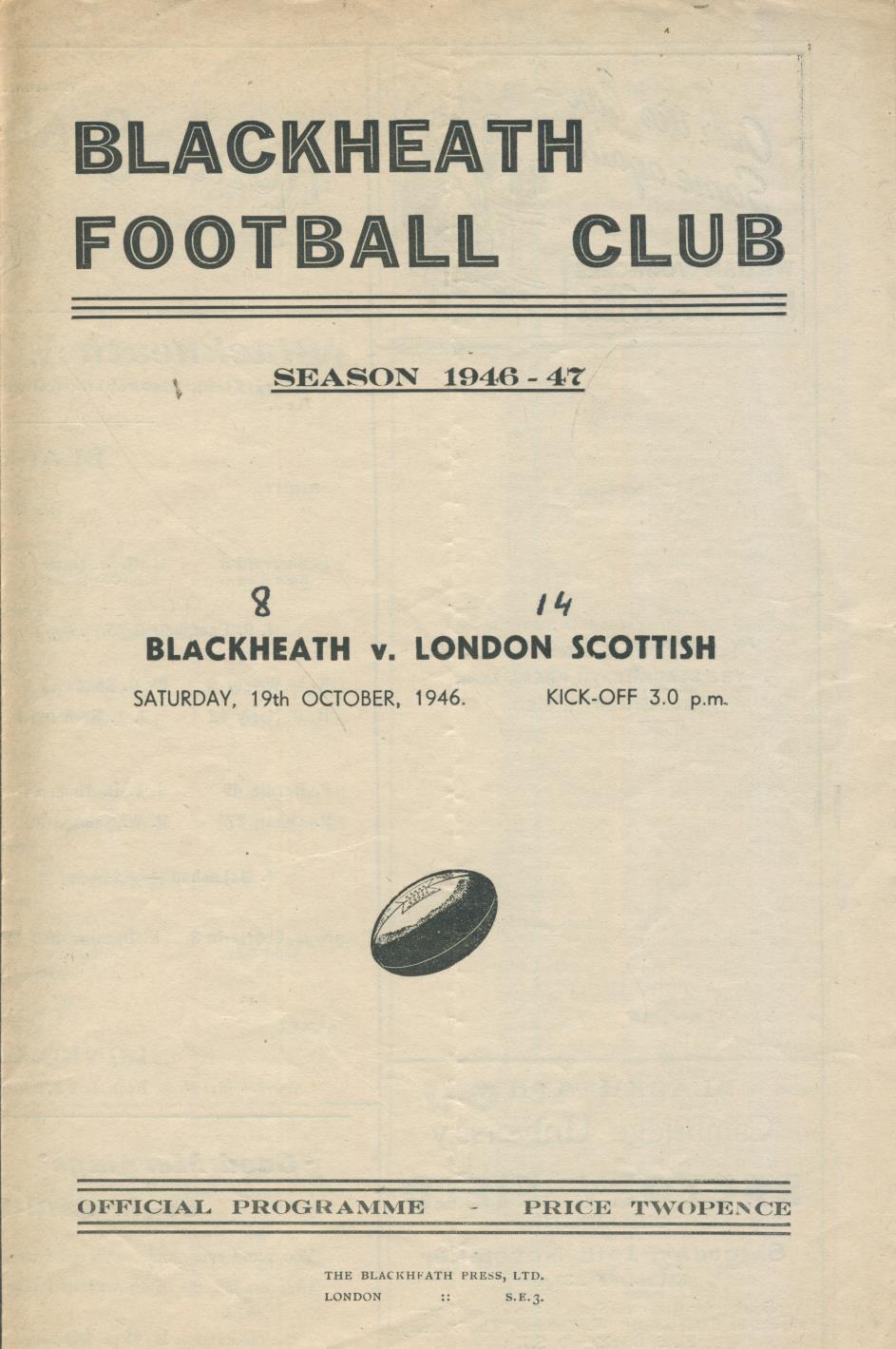 BLACKHEATH V LONDON SCOTTISH 1946 RUGBY PROGRAMME