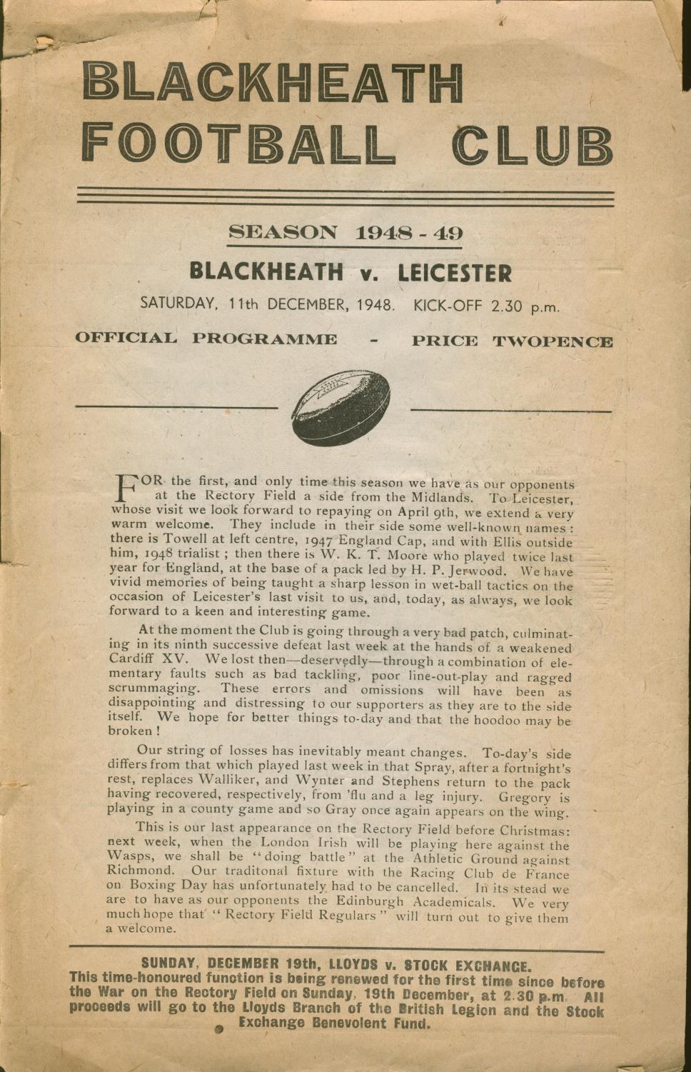 BLACKHEATH V LEICESTER 1948 RUGBY PROGRAMME