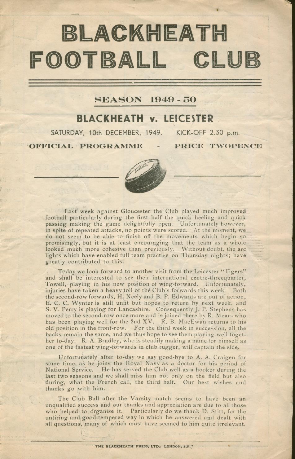 BLACKHEATH V LEICESTER 1949 RUGBY PROGRAMME