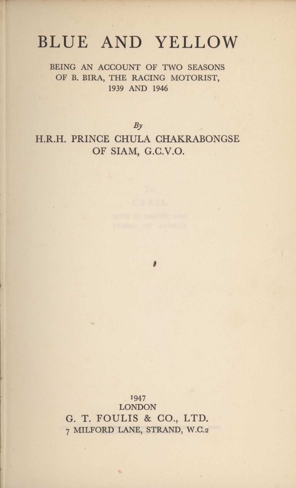 BLUE AND YELLOW: BEING AN ACCOUNT OF TWO SEASONS OF B.BIRA, THE RACING MOTORIST, 1939 AND 1946
