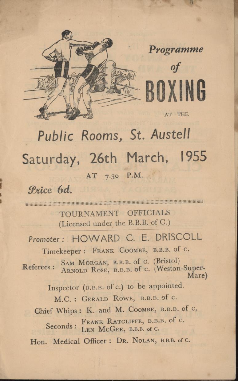Official programme for the event staged at the Public rooms, St Austell on March 26th 1955. Other bouts included Kurt Ernst v Johnny Cheadle and Mike Hughes v Len Granger.
