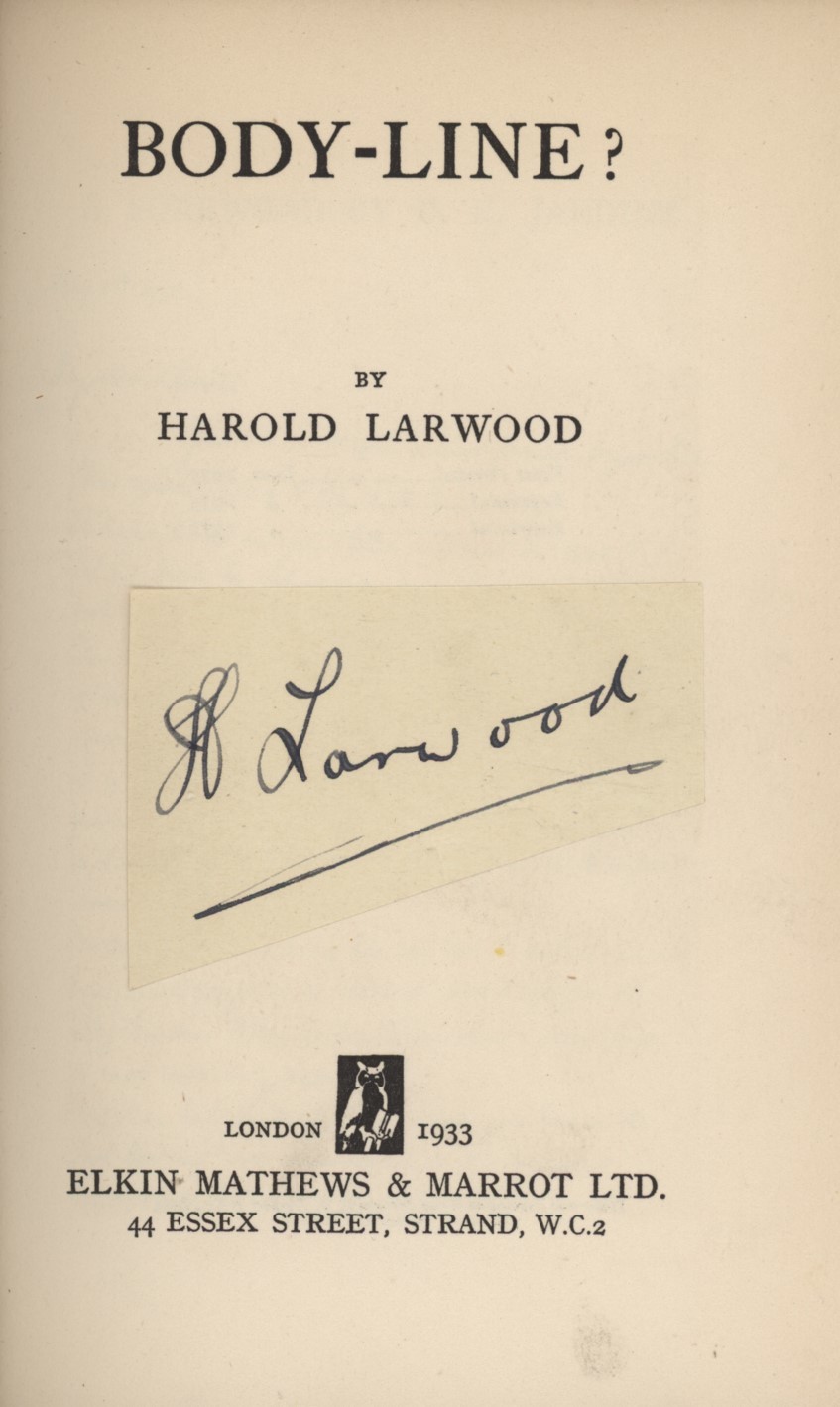 Small 8vo. 220pp. Portrait frontis. (Larwood), 6 plates, 3 diags. Contained within the original, very rare dust-wrapper, which is rubbed and chipped to edges with a further small piece missing to back cover. Light foxing to front and back flaps and some old tape marks to fore-edge. Having said that it is still one of the best dust-wrappers for this book that we have come across. A piece very nicely signed by Larwood in ink has been laid down to title-page.