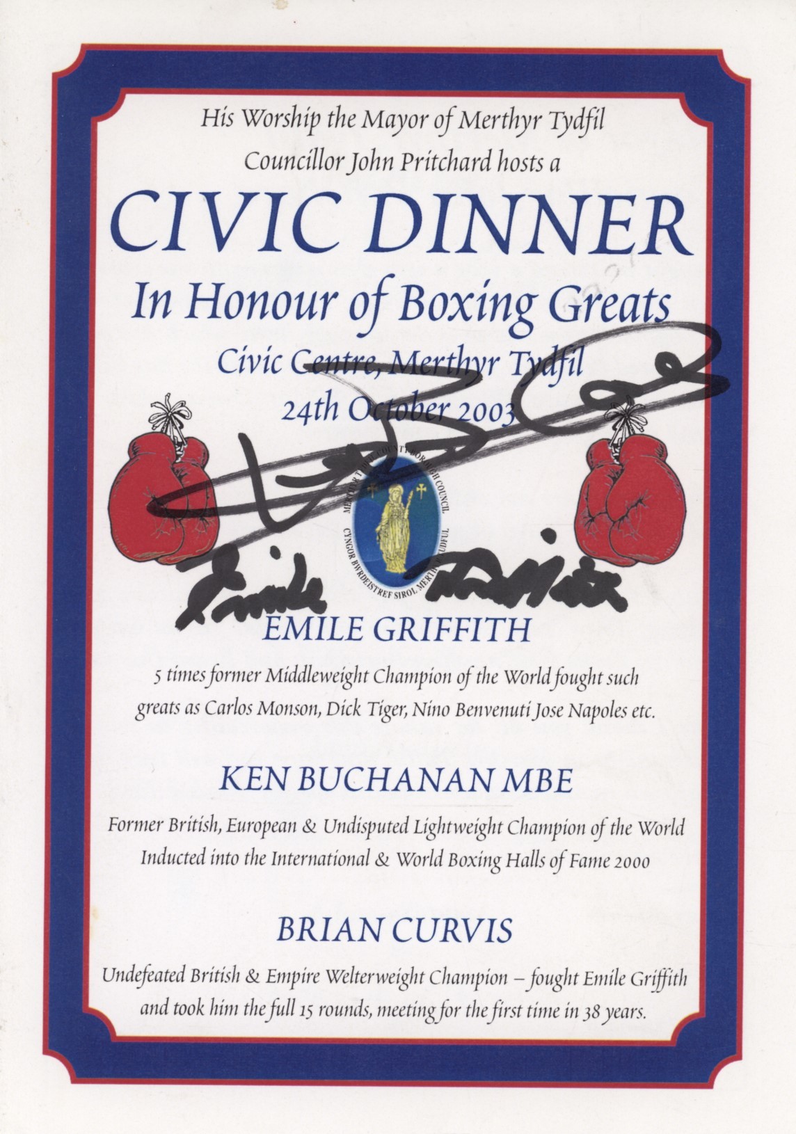 BOXING PROMOTIONAL DINNER PROGRAMME 2003 - SIGNED BY KEN BUCHANAN & EMILE GRIFFITH