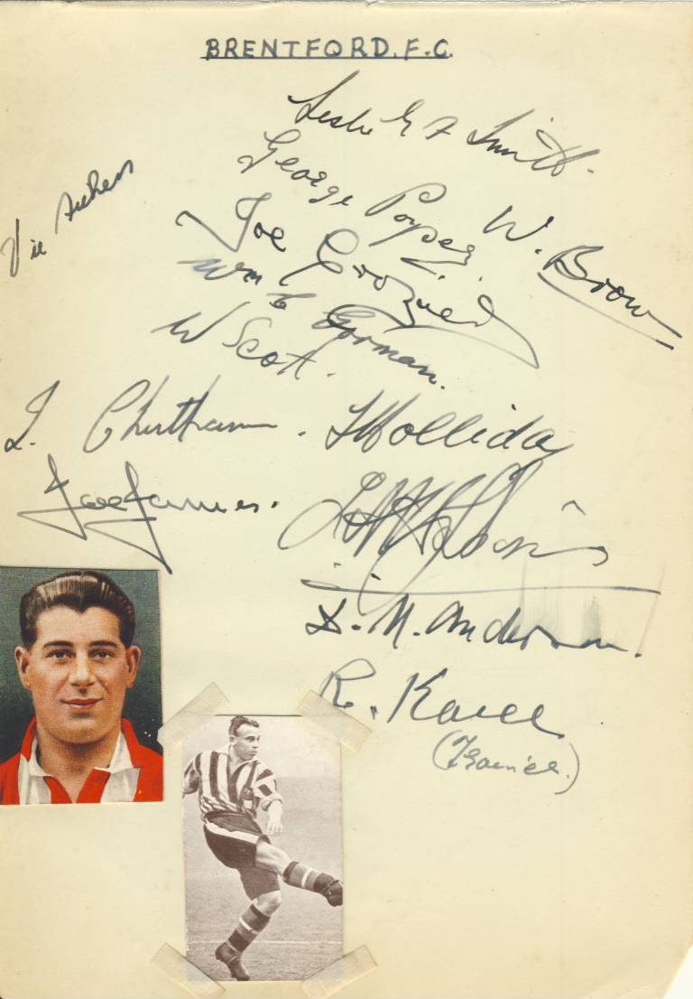 Album page. Signed in ink by 13 Brentford players from the late 1930s. These include Smith, Brown, Poyser, Crozier, Gorman, Scott, Holliday, Gibbons, Anderson, Cheetham, Aicken, James and the trainer (?). Signed on the reverse by Raymond Glendenning and Michael Standing.
