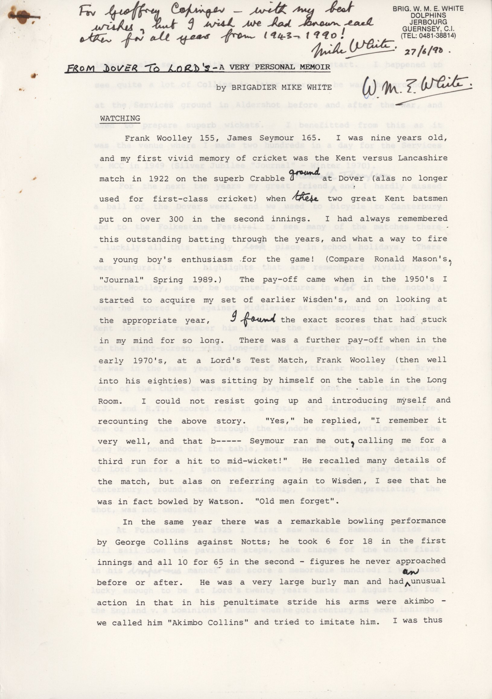 A collection of three autograph letters and associated papers from the former Northamptonshire County Cricket Club player of the 1930s and 40s, who also represented Cambridge University and became aide-de-camp to the Queen in the 1960s, sent to his friend the cricket collector Geoffrey Coppinger in 1990. The material is largely concerned with military cricket matches and his later days playing successfully for Guernsey Island CC. There is also an annotated draft of Brigadier White's 11-page cricket recollections: 'From Dover to Lord's - A Very Personal Memoir'.