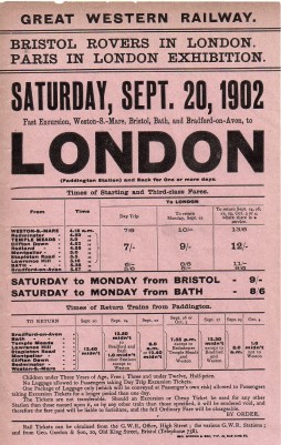 GWR Railway handbill advertising a fast excursion special from Weston-Super-Mare and intermediate stations including Bristol, Bath and Bradford-on-Avon to London Paddington. Attractions listed are "Bristol Rovers in London" and "Paris in London Exhibition."