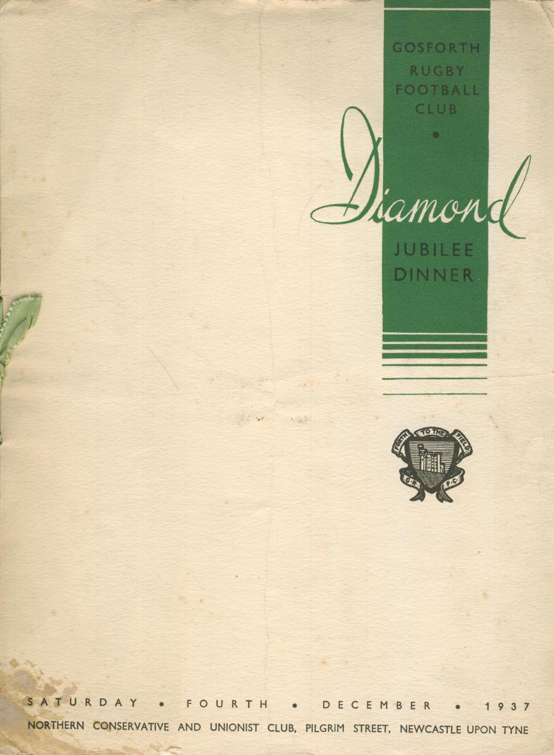 Menu card for the Diamond Jubilee Dinner, held on December 4th 1937 at the Northern Conservative and Unionist Club, Newcastle. Includes historical notes about Gosforth RFC, some team photographs (from significant moments), list of team officials and great past players and a menu list. The club was a precursor of the current Newcastle Falcons.