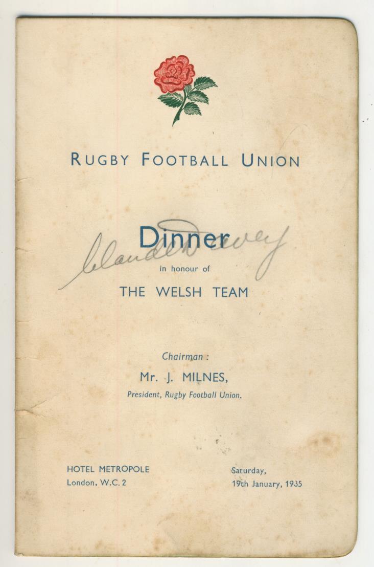 Menu card for a dinner in honour of the Welsh team, held at the Hotel Metropole on January 19th 1935. Earlier in the day England and Wales had drawn 3-3 at Twickenham. Signed to the front cover in pencil by the Welsh captain Claude Davey, and to the back cover in ink and pencil by at least 36 further players, officials and staff. Two further pencil autographs to inside. The autographs include Boughton, Leyland, Candler, Giles, Longland, Kendrew, Jenkins, Cowey, Clifford Jones, Powell, Skym and the referee FW Hassett. From the collection of Jimmy Giles, the England scrum-half.