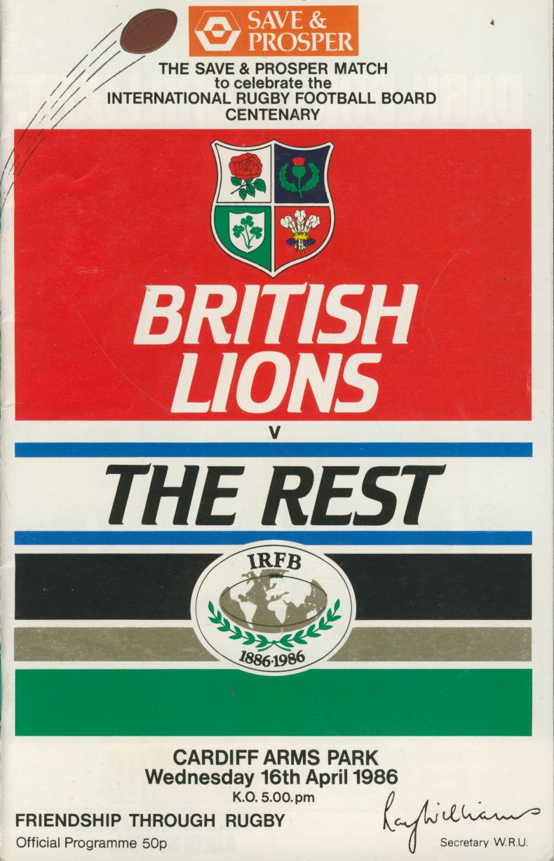 Official programme for the match between the British Lions and The Rest at Cardiff Arms Park on 16th April 1986. The Rest beat the Lions 15-7.