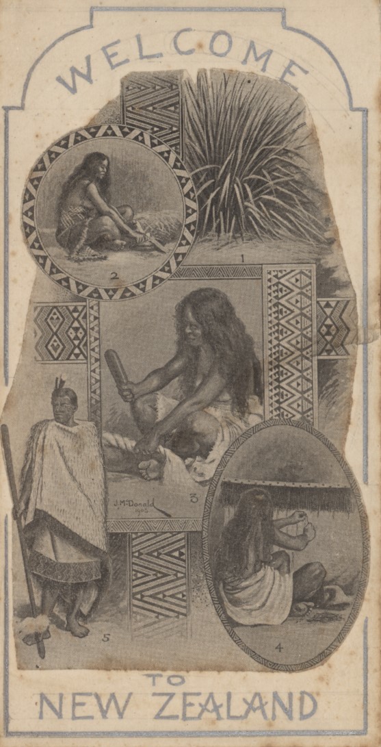 Folded card with original artwork for the itinerary of the British Lions rugby tour to New Zealand in 1908. The front cover is handpainted with intricate designs, including scrolled maps, emblems and the date set inside a rugby ball. The back cover has cut out images of Maoris with the message "Welcome To New Zealand". There are further pencil notes relating to the planned lay-out inside.