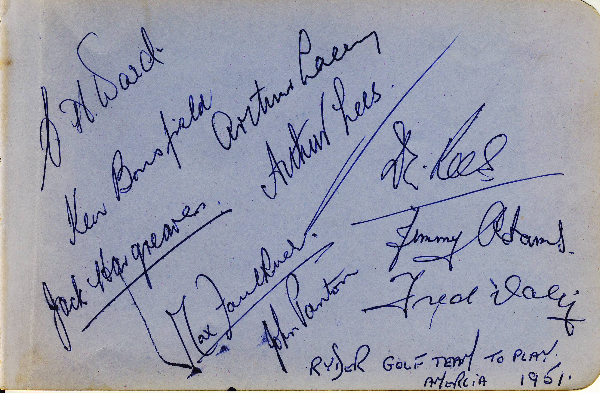 Album page. Signed in ink by 10 members of the British Ryder Cup team that lost to the USA at Pinehurst, North Carolina - Charles Ward, Ken Bousfield, Arthur Lacey, Arthur Lees, Jack Hargreaves (who was selected but did not compete), Max Faulkner, Dai Rees, Jimmy Adams, John Panton and Fred Daly. Harry Weetman has not signed.