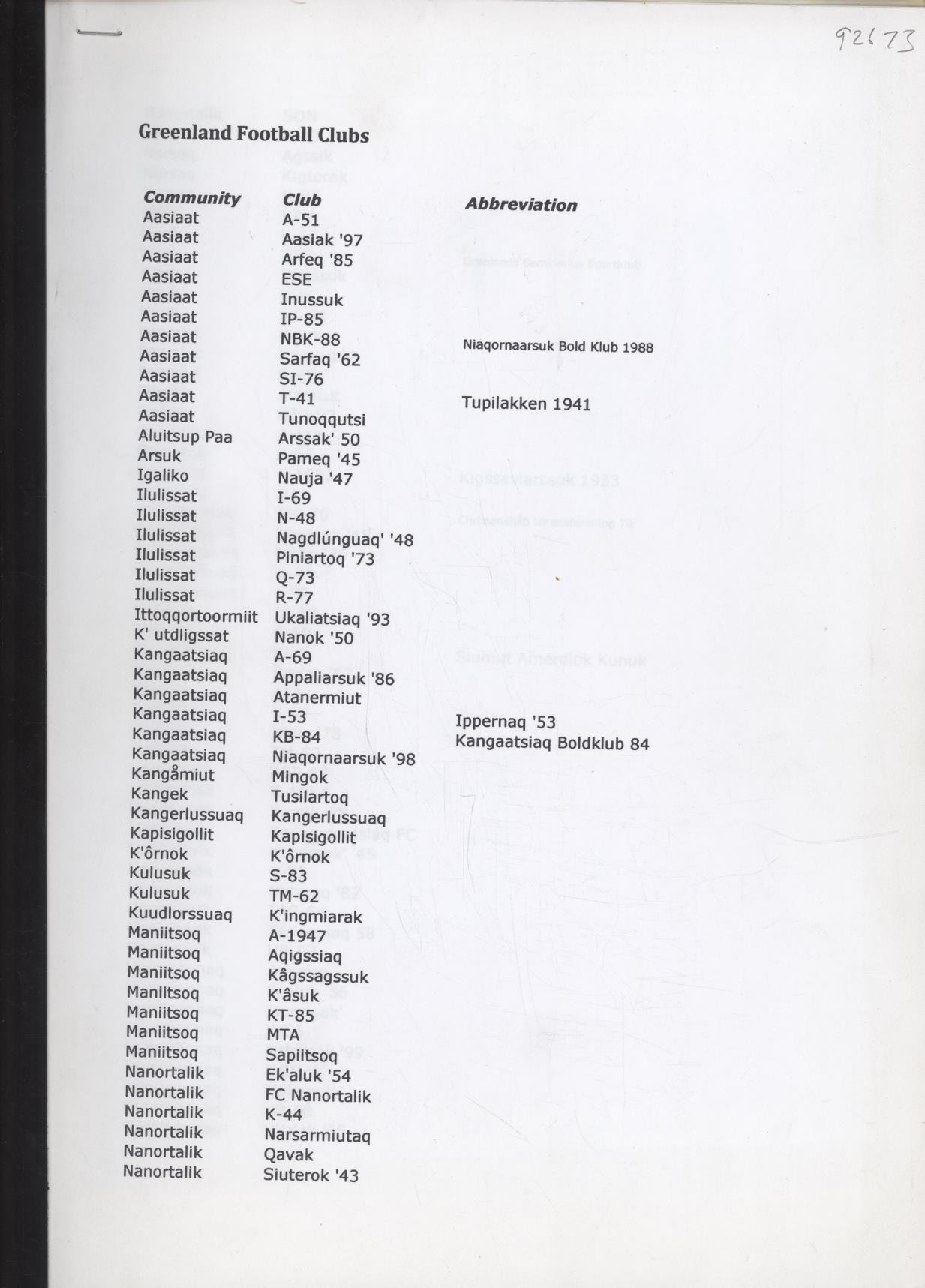 CALCIO 1992 - GLI INDIRIZZI E GLI STADI DELLA GROENLANDIA (GREENLAND FOOTBALL CLUBS)