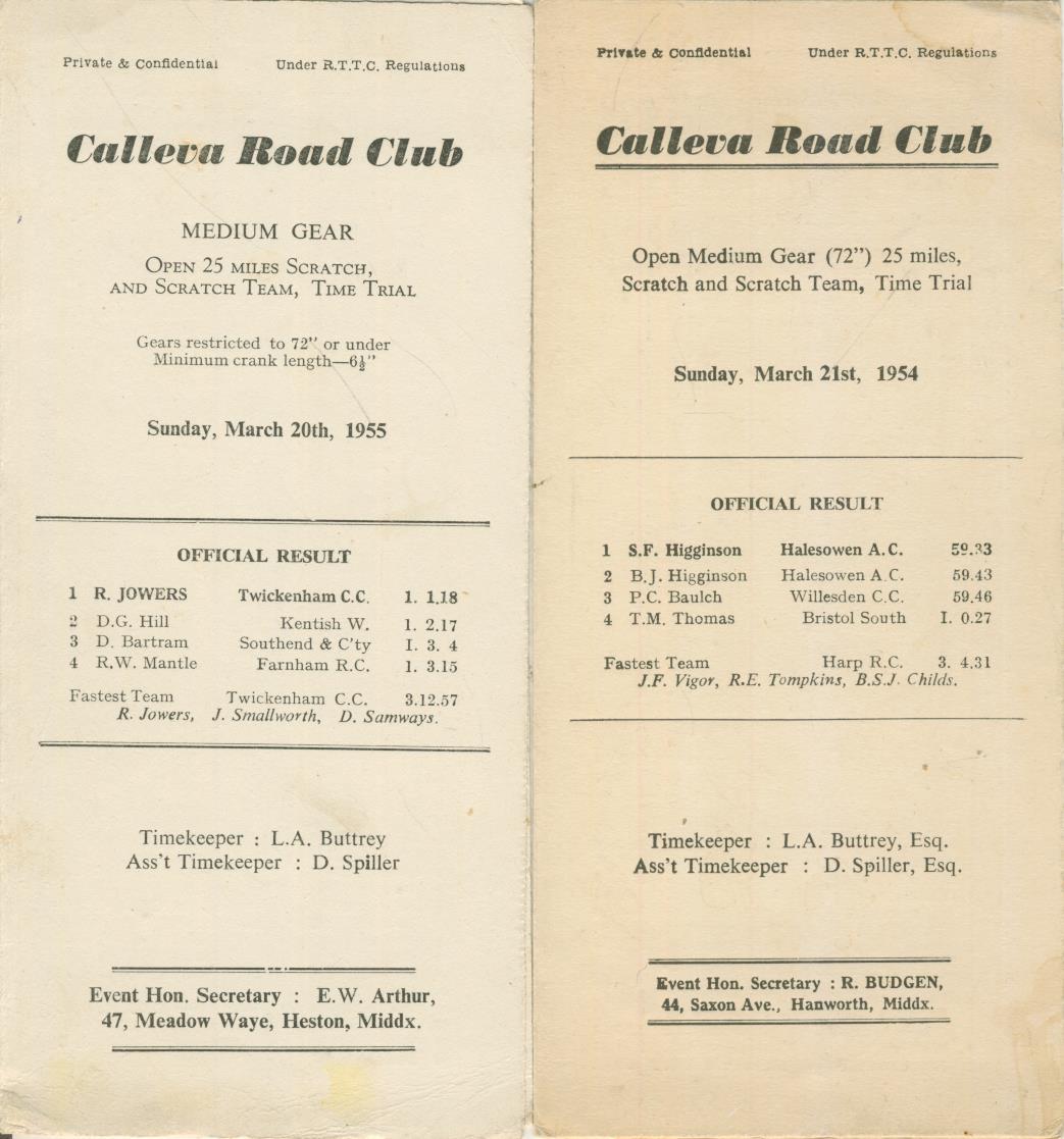CALLEVA ROAD CLUB (WEST LONDON) TIME TRIAL RESULTS 1954 & 1955