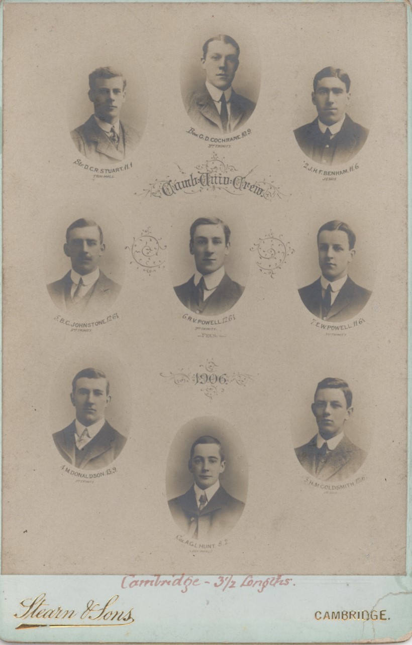 Cabinet card with photographic portraits of the Boat Race crew, including the cox. Margin of victory (Cambridge - 3.5 lengths) written in red ink to lower border. Stearn & Sons, Cambridge. The crew included Banner Johnstone and Ronald Powell.