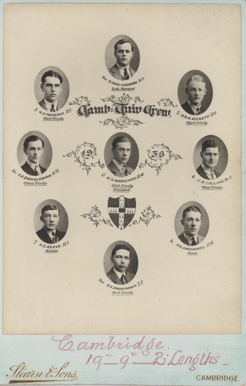 Cabinet card with photographic portraits of the Boat Race crew, including the cox. Margin of victory (Cambridge - 2 lengths) written in red ink to lower border. Stearn & Sons, Cambridge. The crew included David Haig-Thomas and Robert Swartwout.