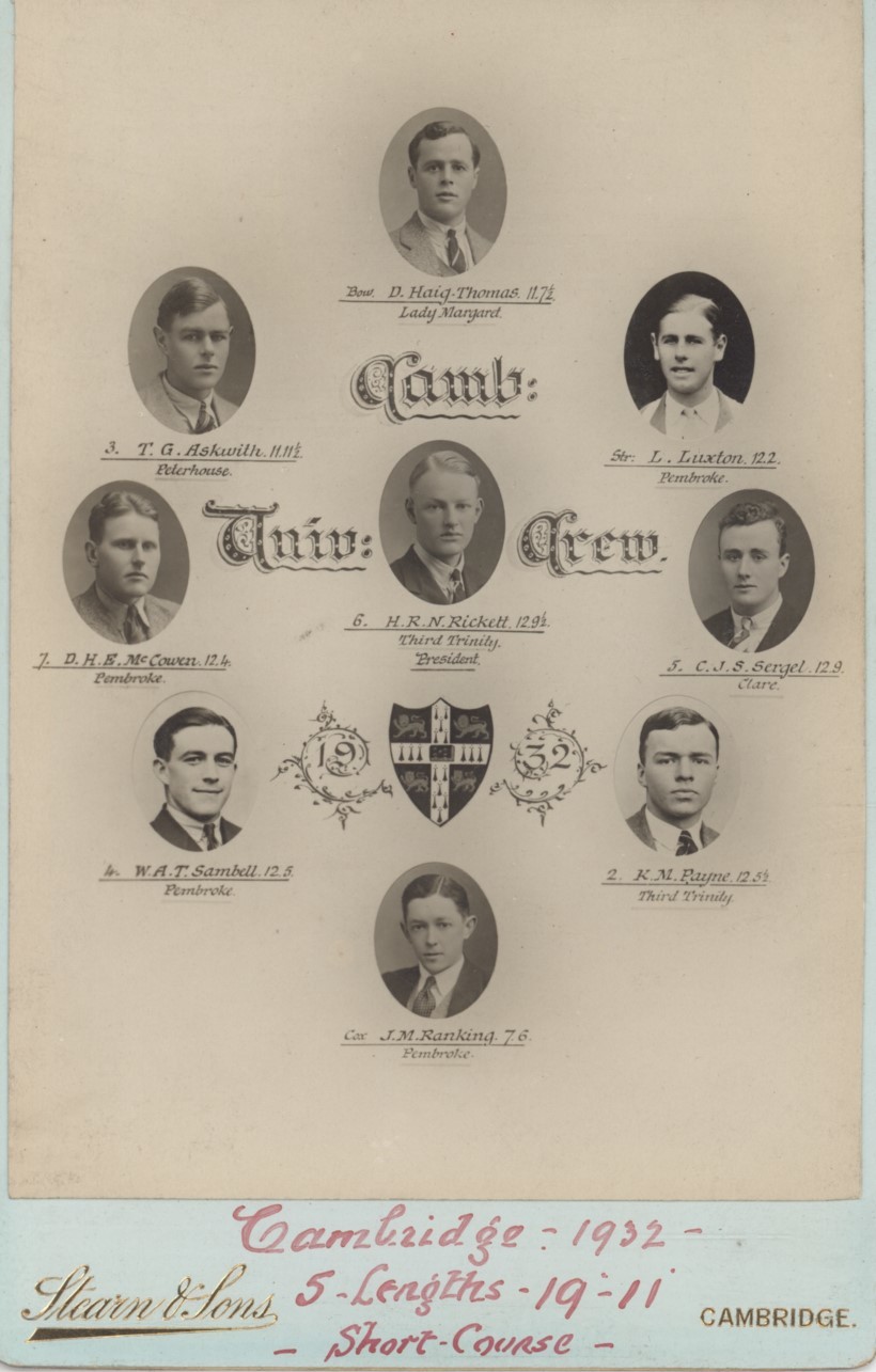 Cabinet card with photographic portraits of the Boat Race crew, including the cox. Margin of victory (Cambridge - 5 lengths) written in red ink to lower border. Stearn & Sons, Cambridge. The crew included David Haig-Thomas and Thomas Askwith. All rowed at the 1932 Olympic Games.