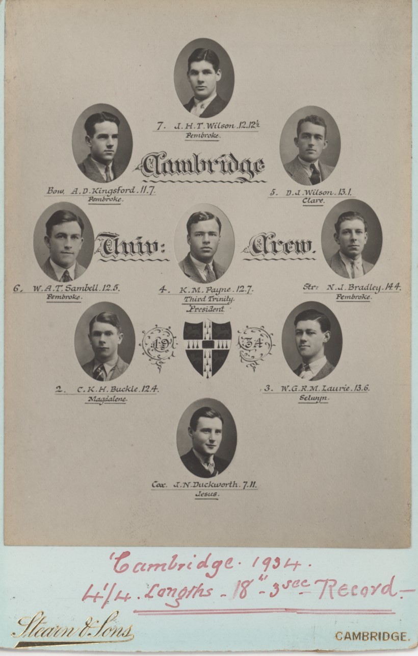 Cabinet card with photographic portraits of the Boat Race crew, including the cox. Margin of victory (Cambridge - 4.25 lengths) written in red ink to lower border. Stearn & Sons, Cambridge. The crew included Ran Laurie and John Wilson.